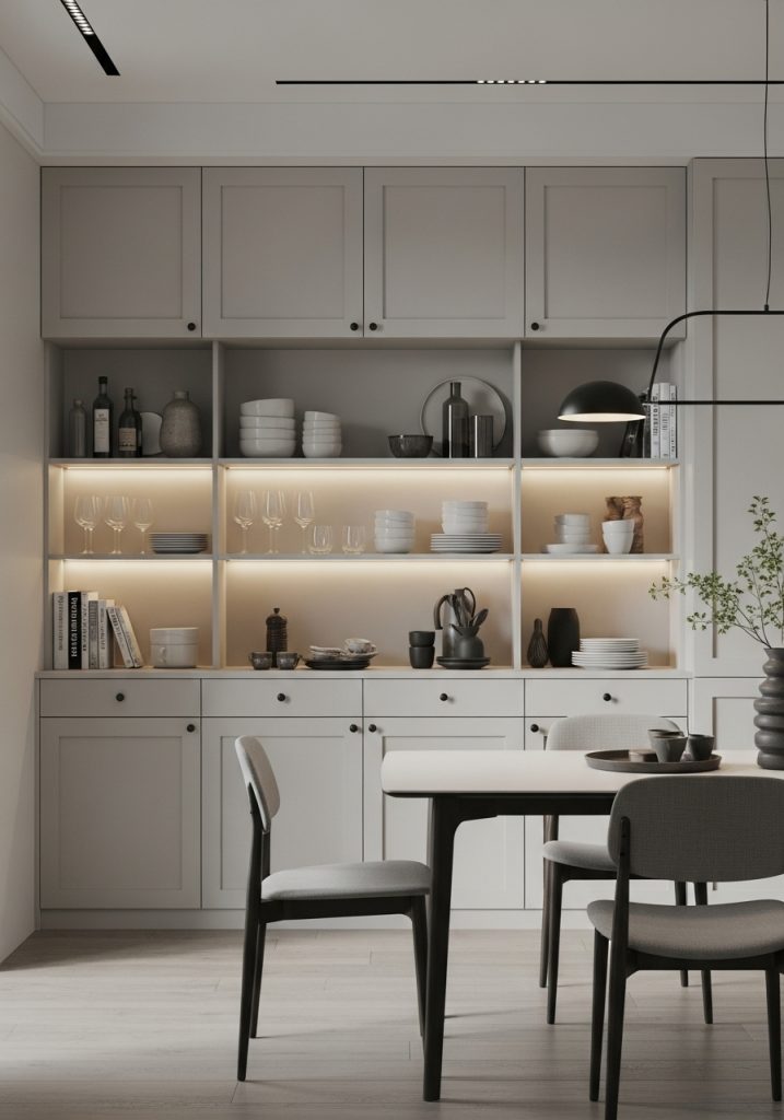 Floor-to-ceiling cabinetry painted to match the walls melts into the architecture, providing massive amounts of storage without visual bulk. You can use a mix of closed cabinets to hide the “ugly stuff” (looking at you, holiday serving platters) and open shelving to display your prettiest ceramics and glassware.