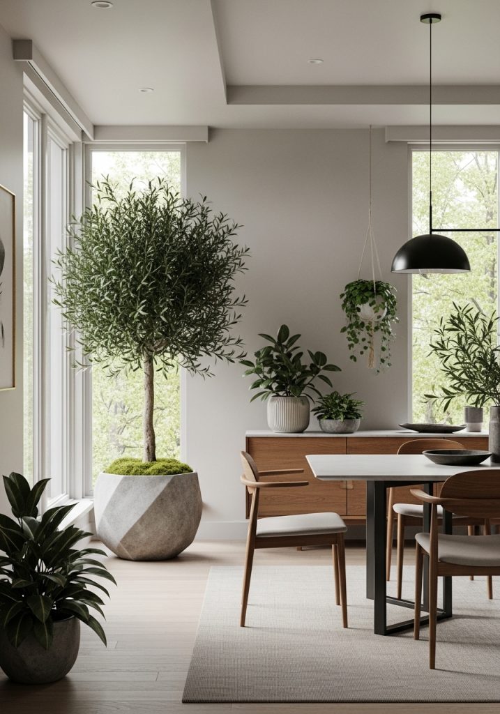 I’m not talking about a sad little succulent in the corner. Go big. Place a large fiddle-leaf fig or a tall olive tree in a statement planter in the corner of the dining room.