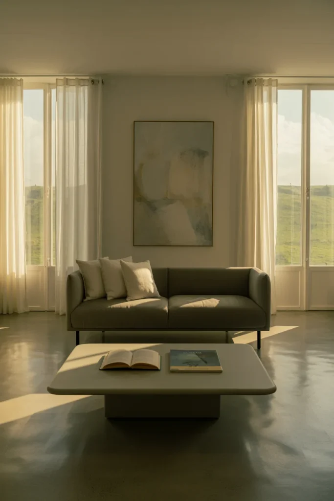 One simple way to introduce minimalist living room designs is by choosing a neutral-colored sofa. A light grey or cream sofa can make your room feel larger, especially when placed near large windows that let in natural light. This way, the focus is on the room’s simplicity and functionality.