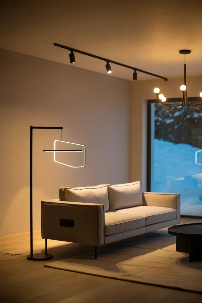 Minimalist lighting doesn’t have to be boring. Choose simple, modern light fixtures that complement your minimalist living room designs. Track lighting or pendant lights with clean, geometric designs can serve as stylish yet functional additions to your space. Consider a statement chandelier or a modern floor lamp for extra ambiance.