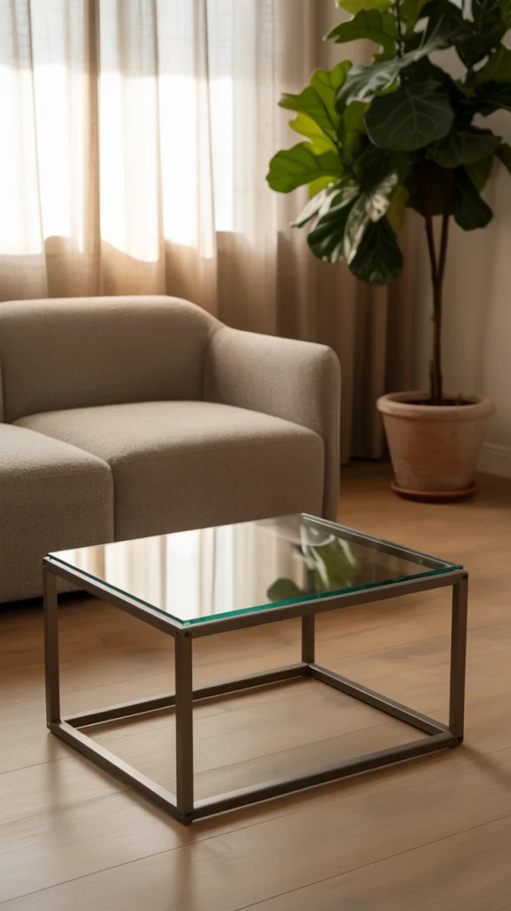Recommended Product: A stylish glass and metal coffee table from Amazon will blend seamlessly into any minimalist living room.
