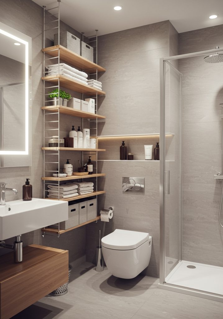 When floor space is limited, it’s time to think up! Vertical storage is where small bathrooms truly shine. I’m talking about utilizing every inch of wall space from floor to ceiling.