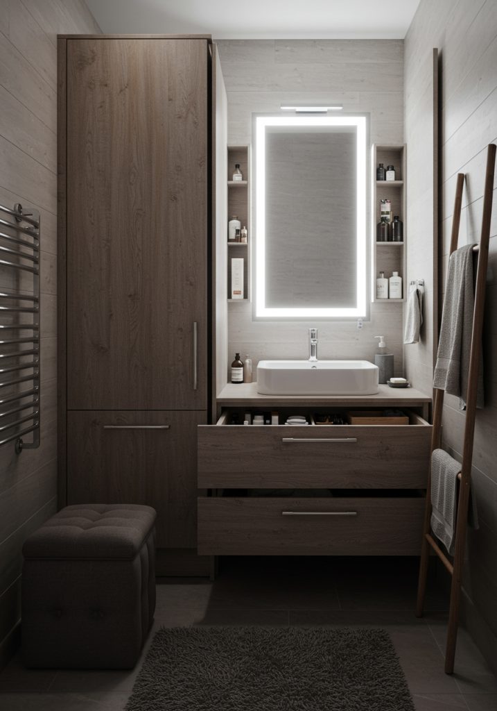 In small bathrooms, every piece needs to earn its keep. Multi-functional items are your secret weapon. A vanity with built-in storage, a mirror with integrated lighting, or a towel ladder that doubles as decoration – these pieces work overtime in small spaces.