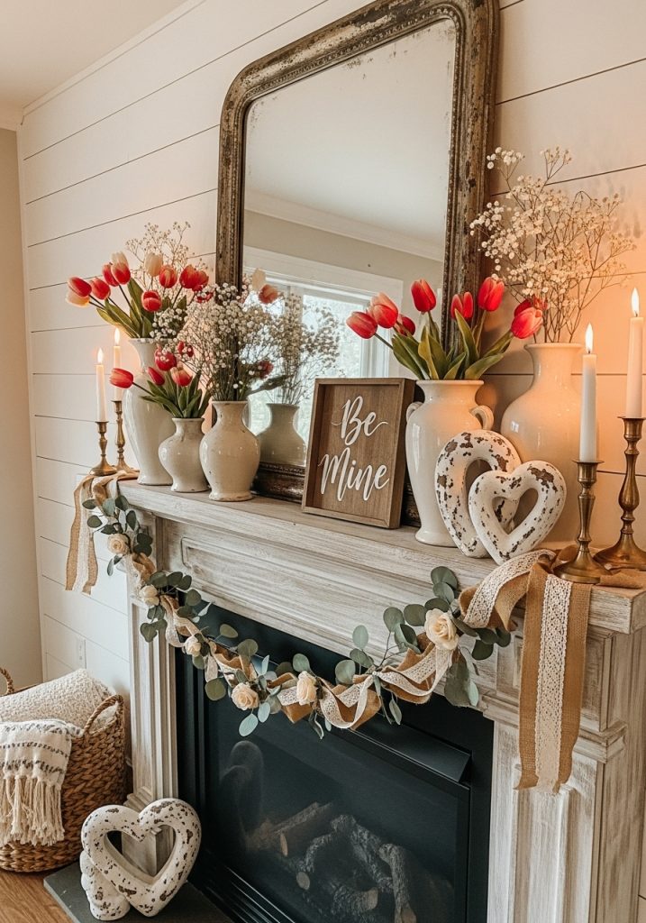 5. Farmhouse Valentine’s Mantel with Rustic Charm