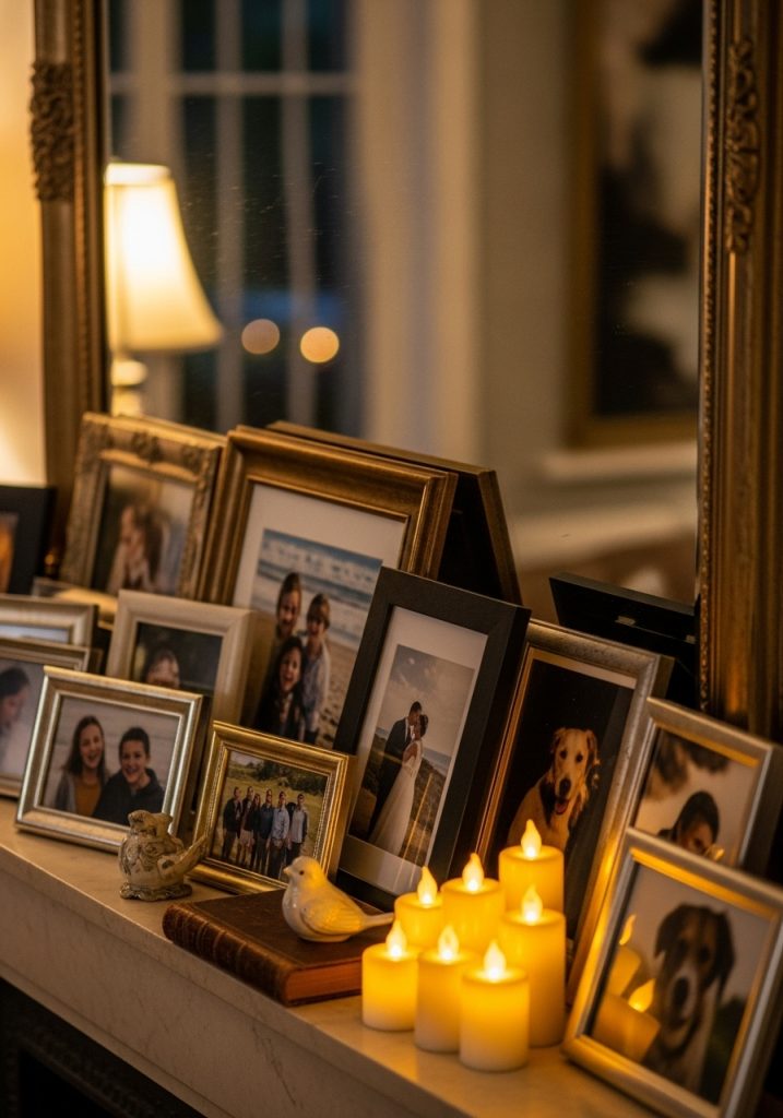 Arrange photos at slightly different heights and layer some in front of others. Keep other decor minimal so the photos stay the main focus. This is a sweet idea for homes where the mantel is visible from your main seating area, especially if your layout is similar to these small living room ideas.
