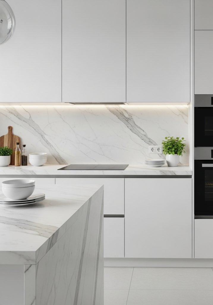 Nothing says luxury quite like white marble. The gray veining in Carrara or Calacatta marble breaks up the white expanse just enough to add drama without overwhelming the space. If you are worried about maintenance (because, let’s face it, red wine happens), consider quartz alternatives that mimic that natural stone look.