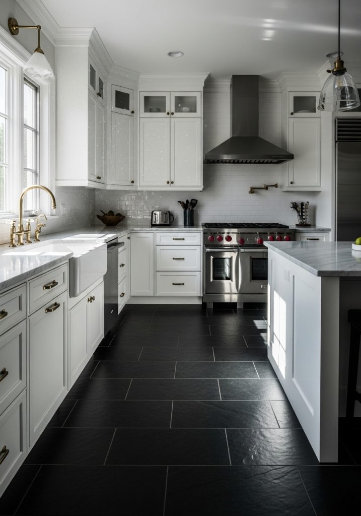 If you are keeping the walls and cabinets bright, why not go dark on the floor? Slate tiles or dark-stained hardwood provide a stunning foundation. It anchors the room and makes the white cabinetry pop.