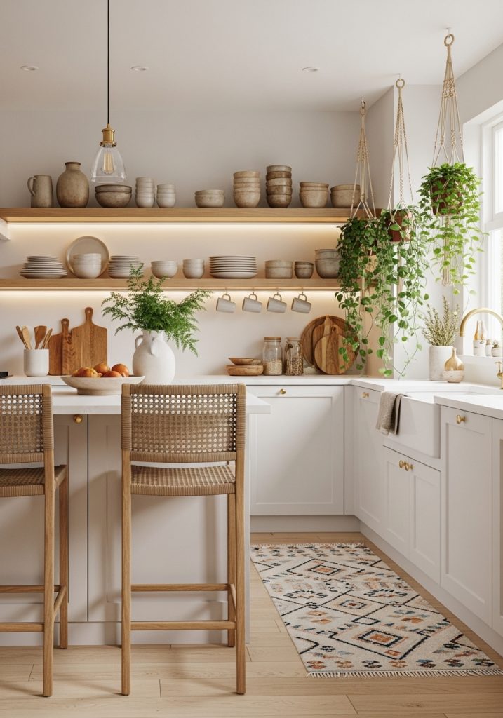 White provides the calm backdrop for boho chaos (the good kind!). Mix white walls with rattan barstools, macramé plant hangers, and open shelving filled with mismatched pottery.