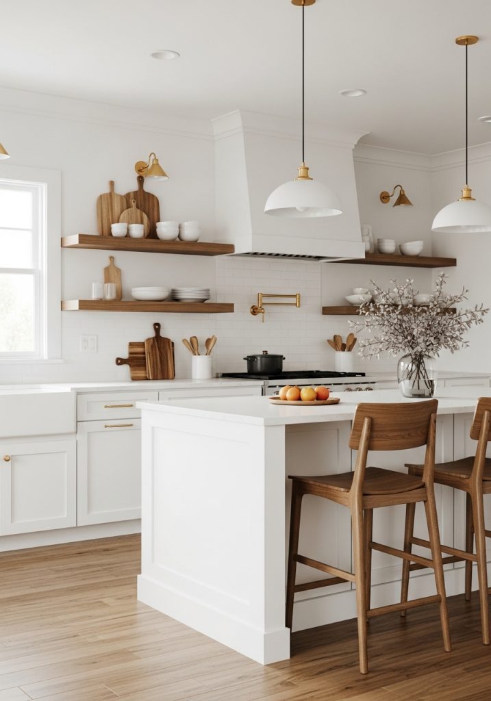If your kitchen feels too cold, wood is the instant cure. I call this the “warming effect.” Incorporating wood through open shelving, bar stools, or even a butcher block island countertop instantly softens the harshness of bright white cabinets.