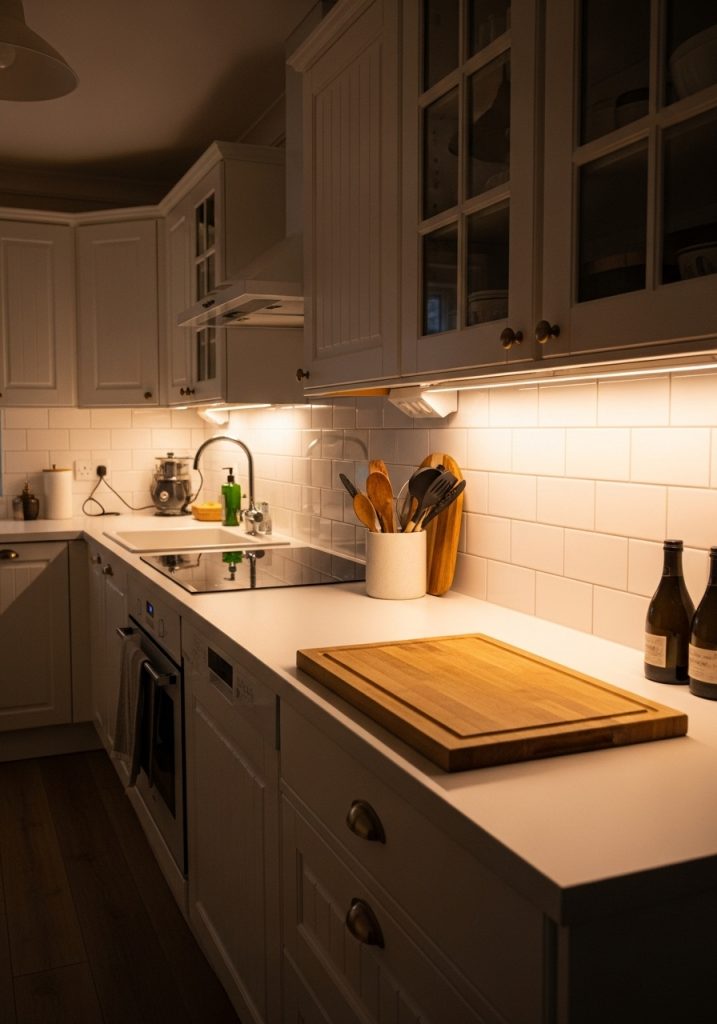This is a functional game-changer. LED strips under your upper cabinets not only help you see while you chop veggies but also highlight your backsplash. In the evening, you can turn off the main lights and leave the under-cabinet lights on for a soft, ambient glow.