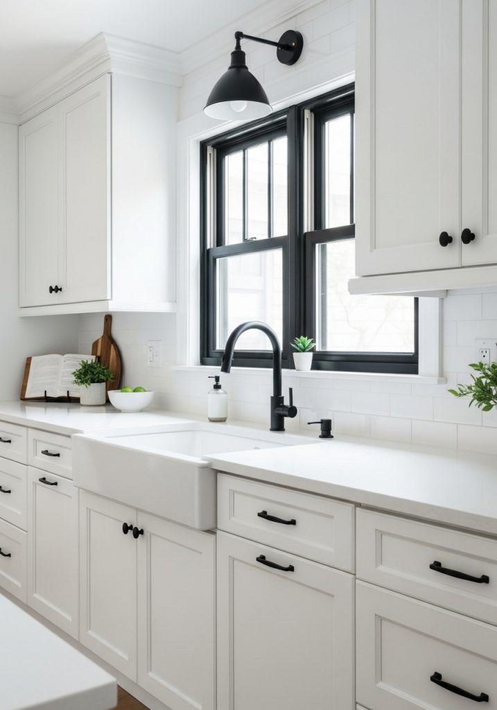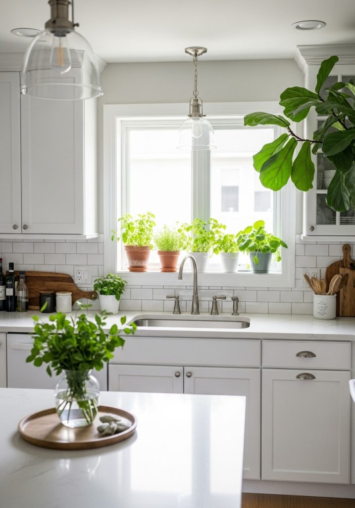 Every white kitchen needs a plant. Period. The burst of natural green breathes life into the sterile palette. Whether it’s a fiddle leaf fig in the corner or fresh herbs on the windowsill, nature is the best decorator.