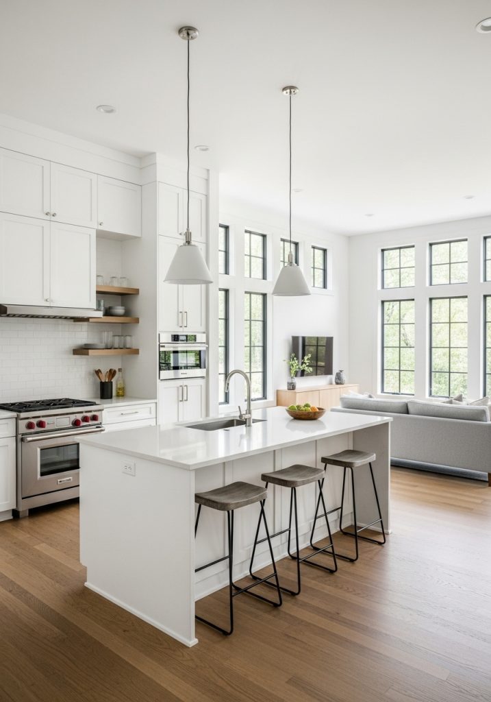 White is known for making spaces feel bigger, which is why it’s perfect for open-concept homes. By keeping the sightlines clear, your kitchen merges seamlessly with your living area.