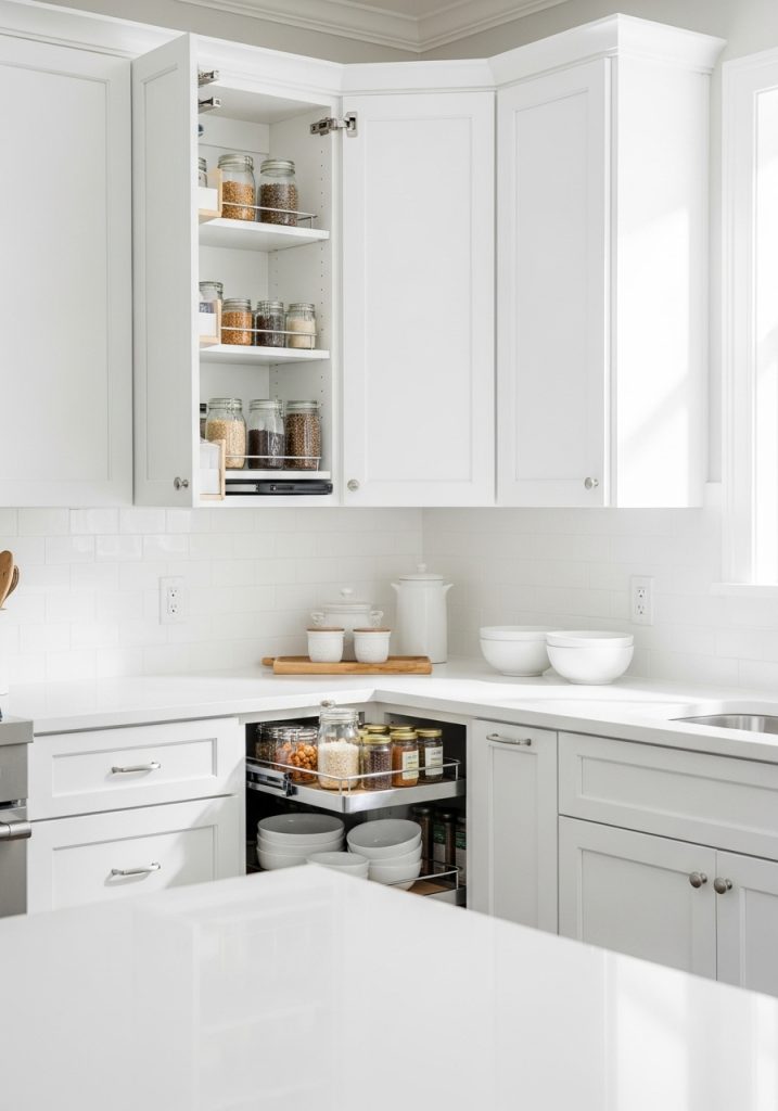 White cabinets can look cluttered if they aren’t organized. Corner cabinets are notorious for being “dead space.” Installing a lazy Susan or custom pull-out drawers ensures your pristine white kitchen remains functional. Need specific solutions? Here are some brilliant kitchen corner cabinet ideas to help you utilize every inch.