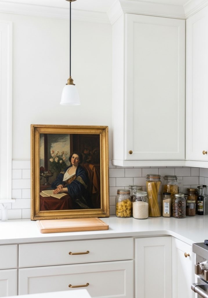 Why should living rooms have all the fun? Leaning a vintage oil painting against the backsplash or hanging a modern print adds so much personality. It tells guests, “Hey, people actually live here.”