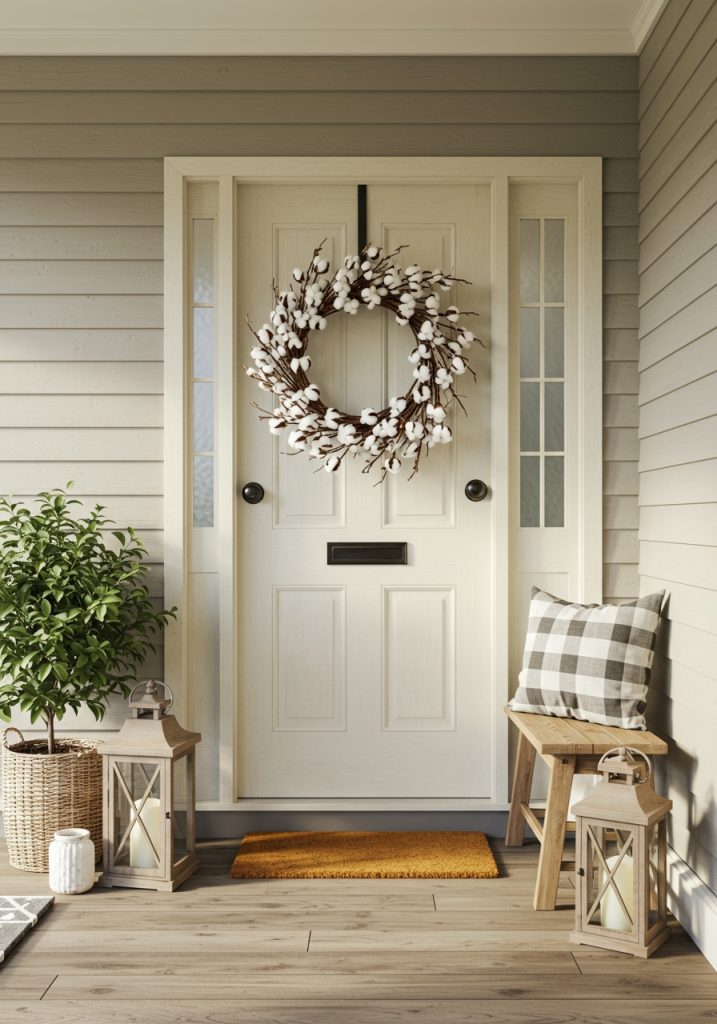 Use faux cotton branches arranged in a circular frame and add twine or linen ribbon. It’s simple, yet it exudes calm—like a quiet snowfall.