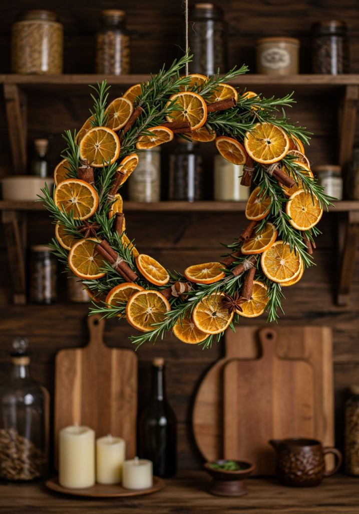 If you love natural scents, a dried citrus wreath will make your space smell incredible. Combine dried oranges, cinnamon sticks, and rosemary sprigs for a visual and aromatic treat.